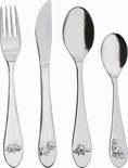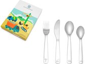 Les Couverts pour enfants Dino sont proposés dans un ensemble de quatre pièces, spécialement conçus pour une personne. Le set comprend : un couteau 190x18 mm, une fourchette 172x22 mm, une cuillère 170x34 mm et une cuillère à dessert 140x28 mm.