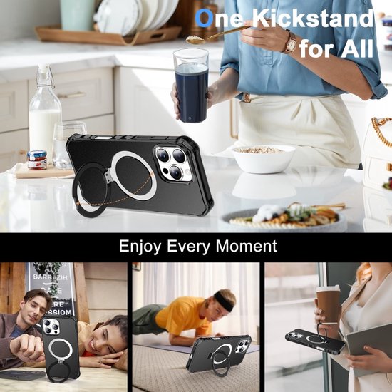Le Ring Kickstand vous permet d'utiliser votre téléphone en mains libres, idéal pour regarder des vidéos ou tenir des vidéoconférences. L'anneau peut également être utilisé comme une poignée confortable, vous permettant de maintenir l'appareil en toute sécurité. Les côtés du boîtier ont également une structure spéciale qui offre une adhérence supplémentaire. Cela rend votre téléphone moins susceptible de glisser de vos mains, même en cas d'utilisation intensive.Convient pour : iPhone 16 Pro