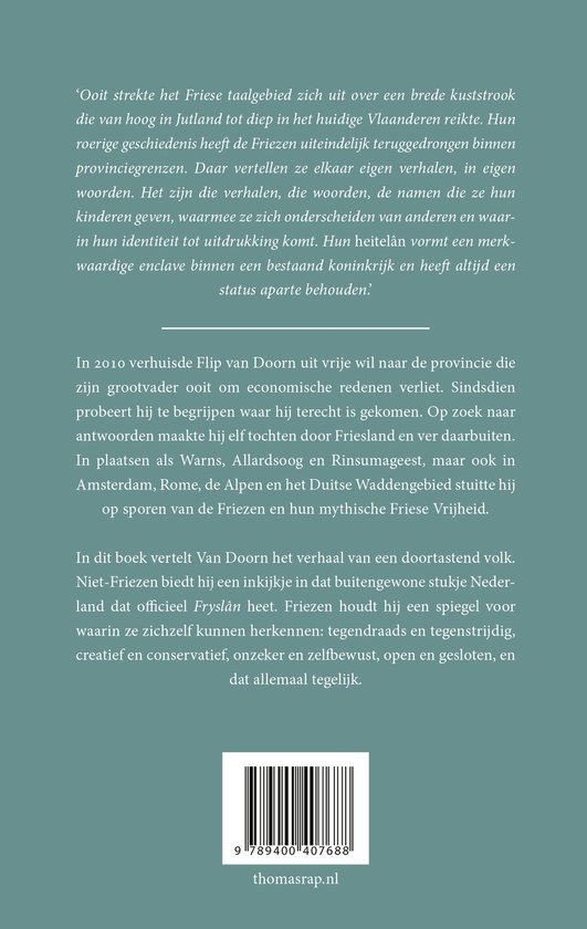 In dit boek vertelt Van Doorn het verhaal van een doortastend volk waarvan de oorsprong en invloed ver voorbij de grenzen van de huidige provincie Friesland reiken. Niet-Friezen biedt hij een inkijkje in dat buitengewone stukje Nederland dat officieel Fryslân heet, Friezen houdt hij een spiegel voor waarin ze zichzelf herkennen: tegendraads en tegenstrijdig, creatief en conservatief, onzeker en zelfbewust, open en gesloten, en dat allemaal tegelijk.