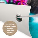 Les Posters de jardin, également appelées toiles de jardin, sont des affiches spécialement conçues pour être accrochées à l'extérieur. Cette nappe de jardin peut donc prendre une raclée. La voile Bisonyl a été utilisée pour cette affiche extérieure. Cette voile est une bâche enduite avec une belle finition. L'affiche de jardin est résistante aux UV, elle ne se décolore donc pas au soleil. Plusieurs anneaux ont été placés dans la toile pour que vous puissiez facilement l'accrocher! Jusqu'à une taille de 120x80 cm, les anneaux sont dans les coins, avec des tailles plus grandes, les anneaux viennent tous les 60 cm. Le tissu peut résister aux différentes conditions météorologiques et durera au moins 3 ans.