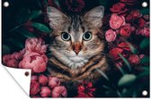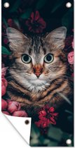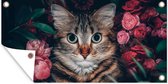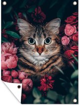Egayez votre jardin avec ce poster de jardin ! L'affiche de jardin montre un gros plan d'un chat. Le chat est entouré de roses de couleur rose.