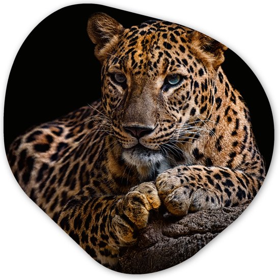 À propos de l'image :Vous cherchez une image élégante pour une décoration murale ? Cette image est parfaite ! Un léopard est représenté sur un tronc d'arbre avec un fond noir. Apportez une ambiance cosy à votre intérieur avec cette forme organique.