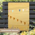 Les Posters de jardin, également appelées toiles de jardin, sont des affiches spécialement conçues pour être accrochées à l'extérieur. Cette nappe de jardin peut donc prendre une raclée. La voile Bisonyl a été utilisée pour cette affiche extérieure. Cette voile est une bâche enduite avec une belle finition. L'affiche de jardin est résistante aux UV, elle ne se décolore donc pas au soleil. Plusieurs anneaux ont été placés dans la toile pour que vous puissiez facilement l'accrocher! Jusqu'à une taille de 120x80 cm, les anneaux sont dans les coins, avec des tailles plus grandes, les anneaux viennent tous les 60 cm. Le tissu résiste aux différentes influences climatiques et est garanti 3 ans.