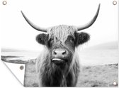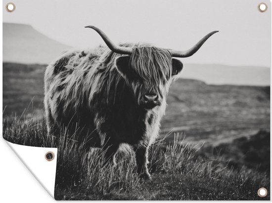 Décoration murale extérieure Highlander écossais - Nature - Vaches - Animaux - Zwart et blanc - 160x120 cm - Toile de jardin - Affiche extérieure