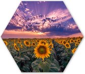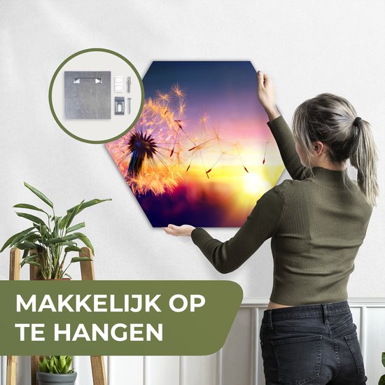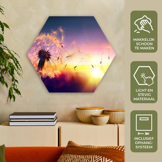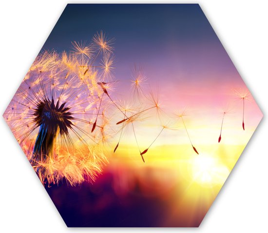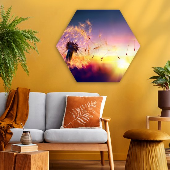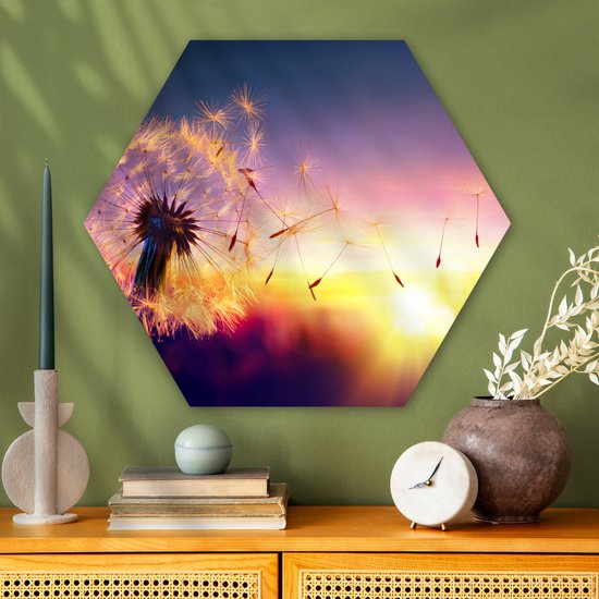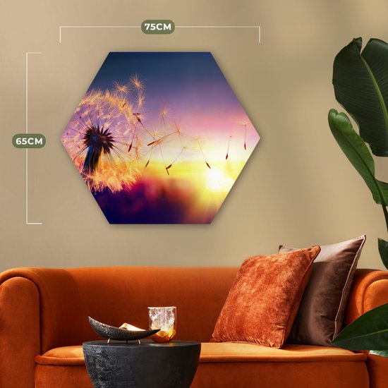 Décoration murale Hexagone - Décoration murale Plastique - Peinture Hexagone - Pissenlit - Fleurs - Coucher de Soleil - Horizon - Nuit - 75x65 cm