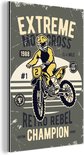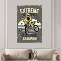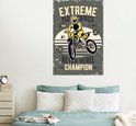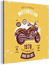 Dessin rétro d'un homme sur une moto jaune. L'homme se dresse sur un fond patiné.