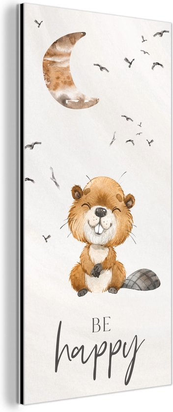Décoration murale Métal - Peinture Aluminium Industriel - Citations - Be happy - Enfants - Lune - Castor - Aquarelle - 40x80 cm - Dibond - Photo sur aluminium - Décoration murale industrielle - Pour le salon/chambre