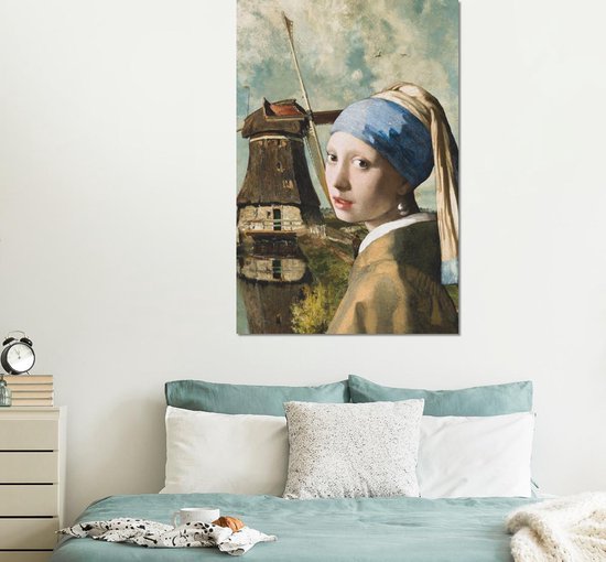 La « Fille à la perle » de Johannes Vermeer est représentée sur cette image sur fond de moulin à vent.