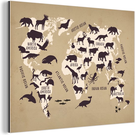 Décoration murale Métal - Peinture Aluminium Industriel - Wereldkaart - Animaux - Marron - 120x90 cm - Dibond - Photo sur aluminium - Décoration murale industrielle - Pour le salon/chambre