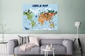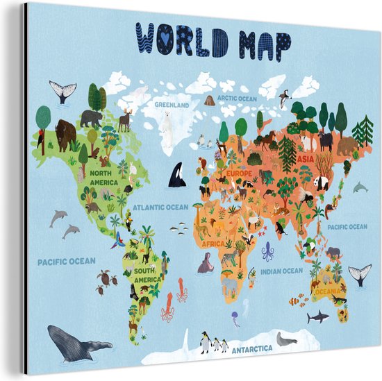 Décoration murale Métal - Peinture Aluminium Industrielle - Wereldkaart - Enfants - Animaux - Arbres - 120x90 cm - Dibond - Photo sur aluminium - Décoration murale industrielle - Pour le salon / chambre