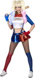 Costume arlequin diable pour femme - Cette tenue arlequin diable pour femme se compose d'un haut et d'un short / jupe avec bretelles. (Perruque, chauve-souris, collants et bottes non inclus). Le haut court est rouge, bleu et blanc, avec le texte Daddys Lil Devil sur le devant. Le short contient une jupe qui lui est attachée. Le shorty est rouge et bleu brillant. Une fermeture éclair est fournie sur le côté pour plus de commodité. Les deux bretelles sont cousues et complètent votre look. Ce costume d'arlequin amusant pour femme est idéal pour une soirée costumée avec vos amis! "