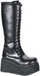 Demonia. Une botte noire mate jusqu'au genou avec des lacets à l'avant. Semelle plateforme 3,25 pouces = 8,26 cm. --- Matériel: Polyuréthane --- Chaussures dans toutes sortes de styles tels que bottes, creepers, escarpins, talons aiguilles, vegan, compensées, steampunk, gothique, punk, clous, emo, grunge, pin-up, vintage, rétro, métal, rock, énervé