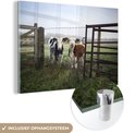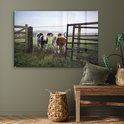 Deux jeunes vaches frisonnes derrière une clôture en fil de fer barbelé Plexiglas 120x80 cm - Tirage photo sur verre (décoration murale en plexiglas)
