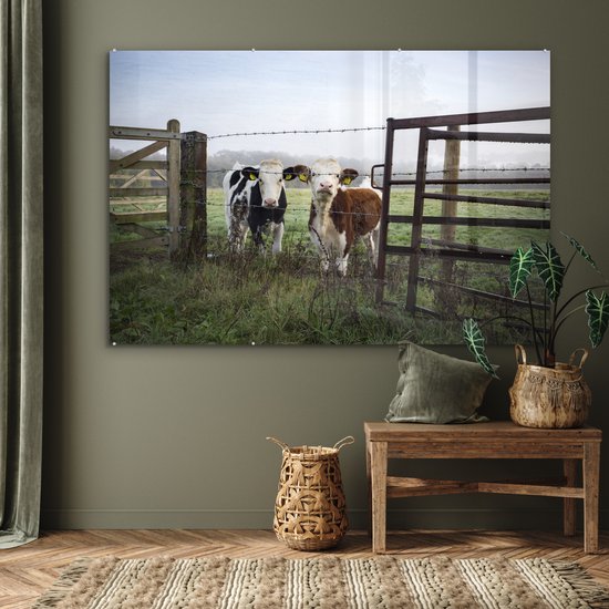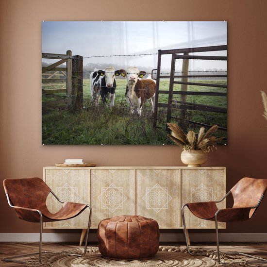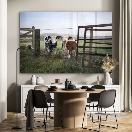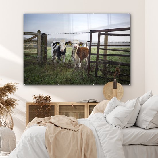 Deux jeunes vaches frisonnes derrière une clôture en fil de fer barbelé Plexiglas 180x120 cm - Tirage photo sur verre (décoration murale plexiglas) XXL / Grand format!