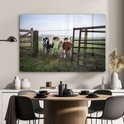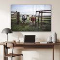 Deux jeunes vaches frisonnes derrière une clôture en fil de fer barbelé Plexiglas 90x60 cm - Tirage photo sur Glas (décoration murale en plexiglas)