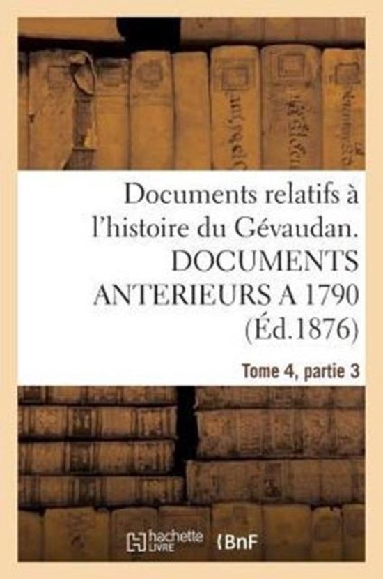 Documents relatifs a l'histoire du Gevaudan. DOCUMENTS ANTERIEURS A 1790, 4Date de l'edition originale: 1876-1893Sujet de l'ouvrage: Gevaudan (France) -- HistoireCe livre est la reproduction fidele d'une oeuvre publiee avant 1920 et fait partie d'une collection de livres reimprimes a la demande editee par Hachette Livre, dans le cadre d'un partenariat avec la Bibliotheque nationale de France, offrant l'opportunite d'acceder a des ouvrages anciens et souvent rares issus des fonds patrimoniaux de la BnF.Les oeuvres faisant partie de cette collection ont ete numerisees par la BnF et sont presentes sur Gallica, sa bibliotheque numerique.En entreprenant de redonner vie a ces ouvrages au travers d'une collection de livres reimprimes a la demande, nous leur donnons la possibilite de rencontrer un public elargi et participons a la transmission de connaissances et de savoirs parfois difficilement accessibles.Nous avons cherche a concilier la reproduction fidele d'un livre ancien a partir de sa version numerisee avec le souci d'un confort de lecture optimal. Nous esperons que les ouvrages de cette nouvelle collection vous apporteront entiere satisfaction.Pour plus d'informations, rendez-vous sur