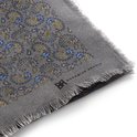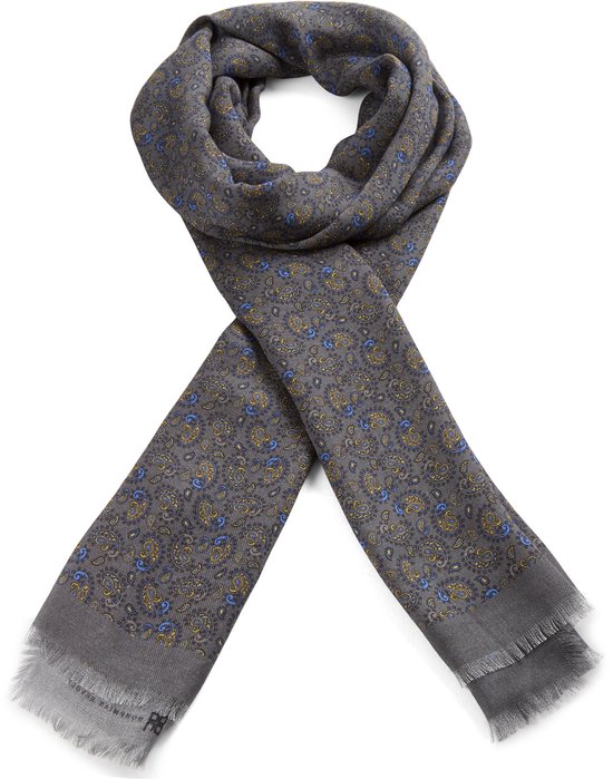 Les bords effilochés de cette écharpe lui donnent un air décontracté absolument irrésistible. Sa trame de fond grise décorée de subtils motifs cachemire bleus et jaunes la rendent très polyvalente : vous pourrez l'utiliser pour accompagner vos tenues les plus formelles comme les plus décontractées.
