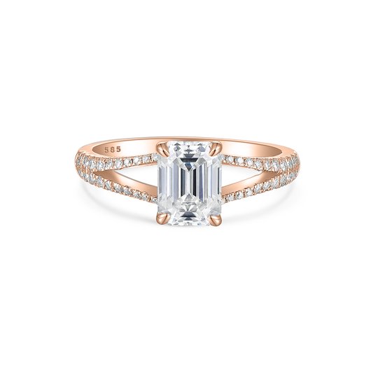 Emelise - Ring moissanite taille émeraude en or rose 14 carats avec Séparation- Tige et pierres latérales en or rose 14 carats - 1 carat