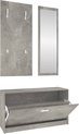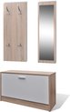 Ensemble 3 en 1: armoire à chaussures, miroir et porte-manteau Armoire à chaussures: Couleur: chêne et blanc Matériau: aggloméré + plastique + alliage d'aluminium Dimensions: 80 x 27 x 46,5 cm (L xlx H) Hauteur du compartiment de rangement: 36 cm Porte-manteau: Dimensions: 45 x 100 cm (L x H) Avec quatre crochets métalliques Miroir: Cadre en bois Dimensions: 30 x 100 cm (L x H) Dimensions du verre: 25 x 90 cm (L x H) Facile à monter ATTENTION: À utiliser sous la surveillance directe d'un adulte.
