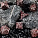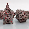 Oserez-vous rouler avec un côté sombre ? L'édition Bloodsplatter est un jeu de dés en métal unique avec un design futuriste, presque mécanique, fini en argent et noir et recouvert d'éclaboussures de sang rouge réalistes. Chaque dé ressemble à un puissant artefact issu d'une guerre oubliée ou d'un monde post-apocalyptique. Les chiffres et les détails profondément gravés confèrent à cet ensemble un aspect robuste, parfait pour les campagnes de dark fantasy ou d'horreur.