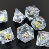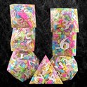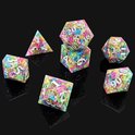 Chaque dé est moulé à la main à partir de résine transparente et rempli d'un mélange coloré de paillettes arc-en-ciel dans une variété de formes et de nuances. Les chiffres sont peints en blanc brillant et contrastent joliment avec le contenu dynamique, ce qui les rend faciles à lire. L'ensemble contient les 7 dés classiques : d4, d6, d8, d10, d12, d20 et percentile d10.