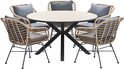 Cet ensemble de jardin six pièces, comprenant la table de jardin ronde Edison et les chaises de jardin en osier Margriet, vous offre une ambiance estivale incomparable dans votre eigen jardin !