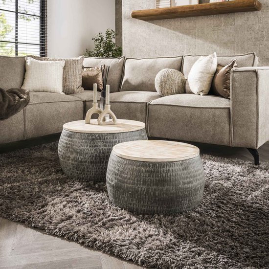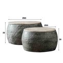 L'un d'un diamètre de 50 centimètres et l'autre de 60 centimètres. Le plateau est en bois de manguier patiné. Le bas des tables est ouvert, ce qui permet de cacher la plus petite table dans la version plus grande, par exemple, ou de ranger soigneusement vos affaires sous chaque table.