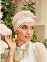 Le turban Amber est construit avec un design large et lisse autour du front et de petites couches à l'arrière de la couronne. La matière en mousseline élégante ajoute de la sophistication au style et le tissu est léger et donne une belle plénitude à l'arrière de la tête. Si vous souhaitez que le modèle soit plus ajusté, vous pouvez tirer le tissu en faisant une couche supplémentaire à l'avant. Attaché au turban, vous trouverez un bandeau amovible. Le bandeau est attaché au dos avec un système de clic. La sangle est composée de deux grandes boucles, qui sortent de l'ensemble élastique à l'arrière. Les boucles sont ensuite reliées à une boucle plus petite et plus épaisse à l'avant créant un effet chignon élégant. Le chignon est placé légèrement vers la droite afin qu'il repose sur l'œil droit lorsque vous portez le turban. Le turban Amber est en polyester, doux au toucher et au toucher. À l'intérieur, le turban est doublé d'un matériau confortable en viscose de bambou, ce qui le rend confortable à porter contre la peau. Cet Amber est confectionné dans un tissu transparent léger conçu avec une base en viscose de bambou blanc crème, de sorte que lorsqu'il est porté, la doublure rehaussera la couleur blanche du turban. Les petits points rouges chauds sporadiques et les formes graphiques décorent le turban si soigneusement, et le fin fil d'or dans le tissu complète le look romantique avec élégance.