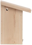 Le bois de cette maison mesure 18 mm d'épaisseur, ce qui assure une isolation parfaite. Grâce au toit en pente, l'eau tombe facilement et l'ouverture d'entrée est protégée contre le vent et la pluie. Le nichoir ne chauffe pas trop à cause des trous de ventilation. Le nichoir est également équipé de trous de drainage. Le design a été bien pensé, car l'intérieur est rugueux. Cela permet aux jeunes oiseaux de sortir plus facilement de la maison. Les rainures sur le devant contribuent également à cela.