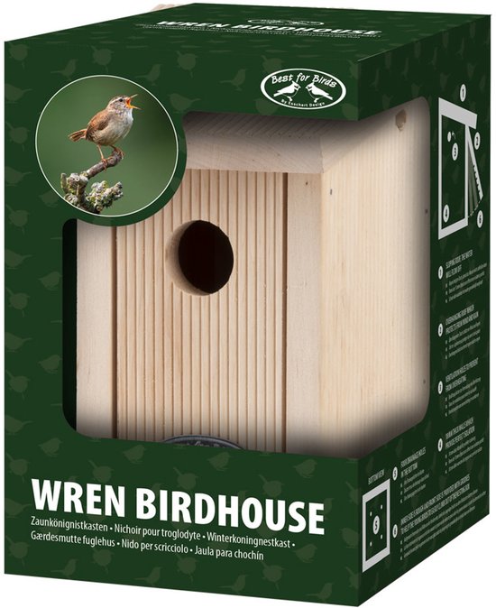 Ce nichoir est spécialement conçu pour le troglodyte. Il y a une ouverture d'entrée d'environ 30 mm à l'avant. Il y a une couverture à l'avant de la maison. Cela peut être ouvert pour nettoyer le nichoir. À l'arrière se trouve un œillet de suspension avec lequel le nichoir peut être facilement suspendu. Attention : ce nichoir ne convient pas aux grands oiseaux de jardin, comme la mésange charbonnière. Il a besoin d'un plus grand nichoir.