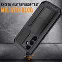 Het hoesje is stofdicht gemaakt, wat ideaal is voor in de bouw of een stoffige omgeving. De camera wordt ook beschermd dankzij een schuifbare luik wat over de cameralens heen gaat wanneer je geen foto's maakt. Een handig uitklapbare standaard aan de achterkant zorgt voor een verbeterede neerzetbaarheid op een tafel. De ingebouwde screen protector bescherm het scherm tegen krassen en barsten. De ingebouwde screen protector kan niet gecombineerd worden met andere screen protectors. Ook niet met de screen protector wat mogelijk vanuit Samsung al op het scherm zit.