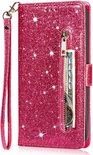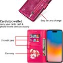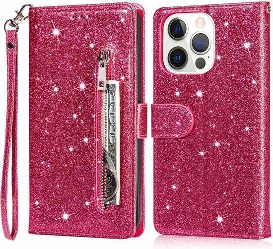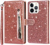 Étui Bookcase à Glitter Adapté pour : iPhone 15 Pro avec fermeture éclair - étui - étui portefeuille - Rose - ZT Accessoires
