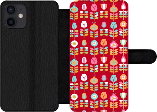Étui pour téléphone iPhone 12 Bookcase - Motifs - Fleurs - Rétro - Rouge - Avec compartiments - Étui portefeuille avec fermeture magnétique