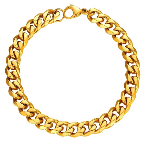 Un beau bracelet en acier inoxydable de couleur or avec maillon gourmand. Le bracelet mesure 9 mm de large et est disponible en différentes longueurs. Le bracelet à maillons finement fini est en acier inoxydable poli de haute qualité et équipé d'un fermoir mousqueton robuste. L'acier inoxydable, également appelé acier inoxydable, ne tache pas, prévient la plupart des types d'irritation et reste beau plus longtemps. Livré avec un écrin à bijoux.