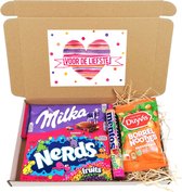Ce paquet contient, entre autres, une boîte à biscuits avec de délicieux biscuits, un pot de mélange de bonbons et un sac kraft de cœurs de fruits.