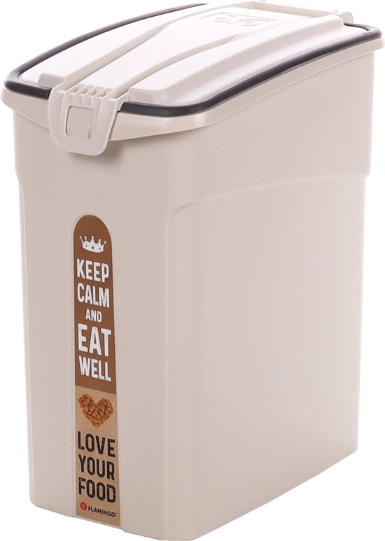 Ce baril d'alimentation beige de Kolio est idéal pour votre animal de compagnie. Il est fabriqué en plastique robuste et possède une poignée qui facilite son déplacement. Le couvercle s'ouvre avec un rabat pratique qui s'enclenche. De plus, il est livré avec une cuillère pour doser facilement les aliments.