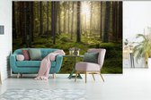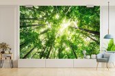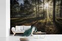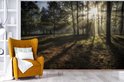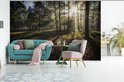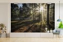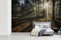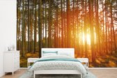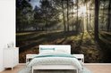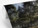 Forêt brumeuse pendant un fotobehang de lever de soleil
