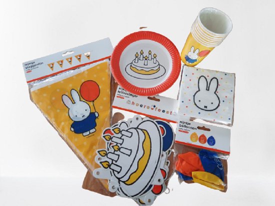 Forfait fête Nijntje 6 pièces: 8 assiettes 8 tasses 20 serviettes 6 ballons guirlande de lettres et une ligne de drapeau 6 mètres - fête d'anniversaire