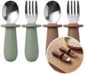 Funnies Kinderbestek 8-delig - Babybestek avec 4 cuillères & 4 fourchettes - Silicone & RVS - Sans BPA et sûr - Pour bébés & tout-petits - Idéal pour manger & grignoter - Design durable - Caramel & Stone Green