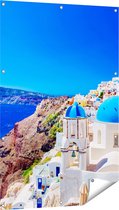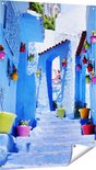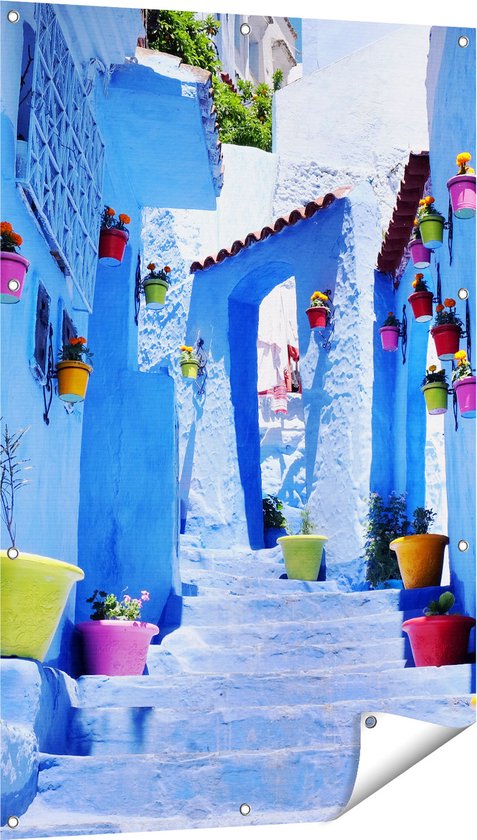 Gards Affiche de jardin Maisons bleues avec Pots de fleurs au Maroc Chefchaouen - 80x120 cm - Toile jardin - Décoration de jardin - Décoration murale extérieur - Tableau jardin