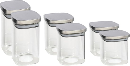 Set de 6 bocaux de cuisine en verre en 3 tailles (1500 ml – 1100 ml – 800 ml). Avec des couvercles hermétiques à clic en acier inoxydable pour conserver les aliments plus longtemps. Cet ensemble contient 2x pièces de 800 ml (10 x 12 cm) et 2x pièces de 1100 ml (10 x 15 cm) et 2x pièces de 1500 ml (10 x 19 cm). Les bidons/pots de stockage vont au lave-vaisselle, mais le lavage à la main est recommandé.
