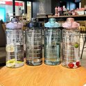 Ce gobelet est généralement de grande taille, avec une capacité de 2 litres (soit environ 8 verres d'eau). Ce qui distingue cette tasse, ce sont les marquages horaires appliqués sur le côté. Ces marqueurs indiquent la quantité d'eau que vous auriez dû boire à des moments précis de la journée, comme le matin, l'après-midi et le soir.