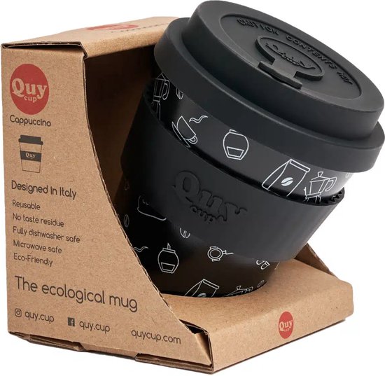 Gobelet de voyage écologique Quy Cup 230 ml - « MOKA » - Sans BPA - Fabriqué à partir de Bouteilles PET recyclées avec couvercle en Siliconen noir