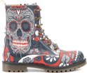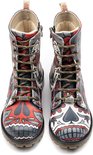 Bottes longues recouvertes d'incontournables motifs tête de mort. Bottes longues écologiques et élégantes avec une semelle confortable et du cuir végétalien.