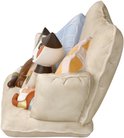 La mère et l'enfant sont assis confortablement ensemble sur le canapé. Le chaton se sent en sécurité et ronronne pour lui-même.
