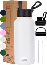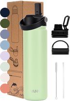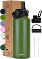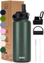 Gourde 1 litre gourde avec paille - Carafe à eau adultes - Set complet - Acier inoxydable - 24h froid/12h chaud - Vert Vous versez 1 euro à Plastic Soup Fond de teint pour chaque bouteille achetée