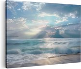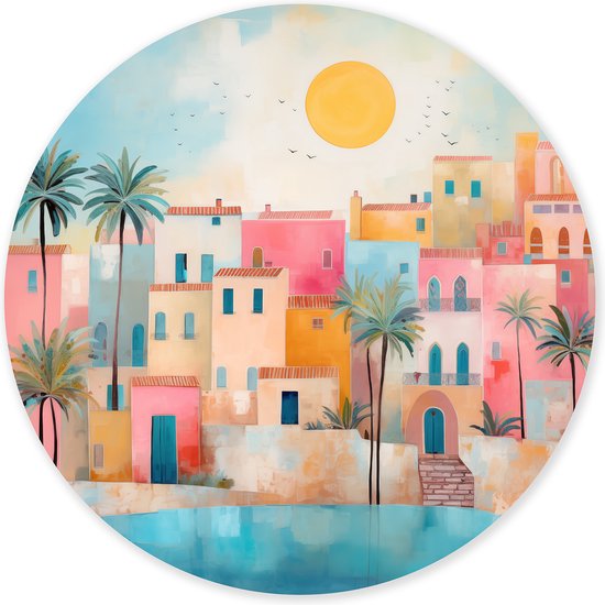 Graphic Message - Cercle mural - Village tropical coloré - Paysage méditerranéen - Décoration murale de salon - Art moderne - Palmiers - Ensoleillé - Turquoise - Blauw - Maisons colorées - Espagne - Portugal - Égypte