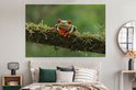 Une représentation d'une grenouille ara aux yeux rouges perchée sur une branche couverte de plantes vertes. La grenouille regarde vers la caméra. Cette image prend tout son sens dans le salon.