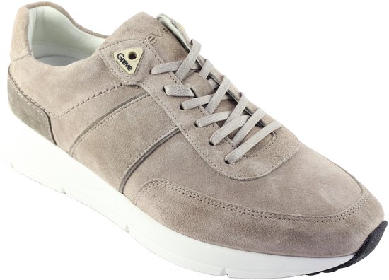 Baskets Greve en daim taupe. Art. Walker 7286 a une semelle en caoutchouc blanc flexible avec une bande de roulement noire et blanche. Cette sneaker est doublée de cuir. équipé d'une assise plantaire amovible et conçu dans une largeur H (pour les pieds plus larges)