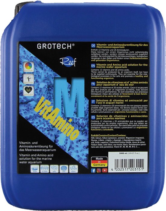 Le Grotech Vitamino M contient pas moins de 11 vitamines essentielles et 20 acides aminés. Ces nutriments sont vitaux pour les poissons et les animaux inférieurs. Ce qui rend ce produit si spécial, c'est qu'il contient des acides aminés que l'organisme ne peut pas absorber de manière autonome. Cela signifie qu’ils doivent être constamment alimentés de l’extérieur pour assurer la santé optimale de vos animaux.